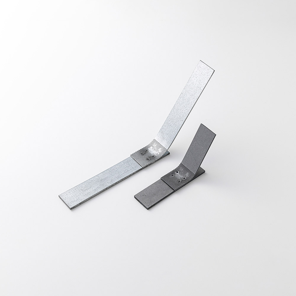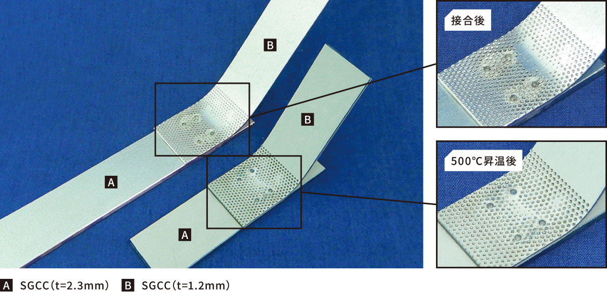 〈亜鉛めっき鋼版〉間の音波接合が可能となった。接合後に500℃に昇温(下パーツ)。